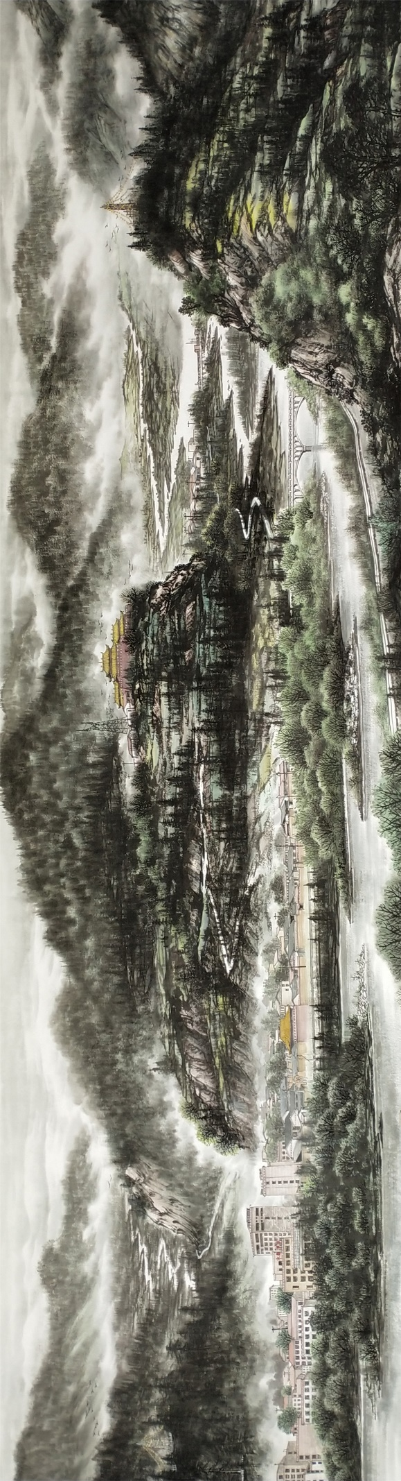群山环绕,一池碧水,云遮雾绕,云来山更佳,云去山如画。要从这重山密岭流泉百道的洮河源头画起,首先要做到认识这里的状况环境。一个从雪山到草原的变化,一个从巍峨壮观到地势平缓,一个从极小的泉水到会聚成小溪,一个从渺无人烟到牛羊处现的过渡过程。更多理解才真正显示出地域性格,这里山势巍峨、长峰挺拔而醒目。它们以突兀的峰峦、冷硬的山脊和崚嶒的岩石,有的已经凝冻千年,有的随着季节变化融化了又再次冻结,强烈地呼应了西倾雪山的料峭与峥嵘。为了表现山势的砍切感和岩石的荒酷感,从传统山水画中提取资源,勾皴并使,长、短斧劈皴结合,创造出一种独特的皴法来表达运用,让积雪覆盖下的山体得到了深入的表现。