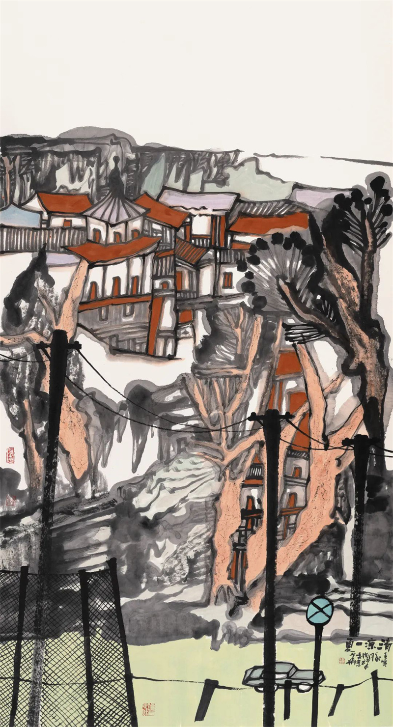 大胆简洁的用笔,淋漓氤氲的墨气,欲正还斜的构图,似断还连的递进空间,拉开了与古人的距离,也拉开了与自然的距离,成功地建构出疏离现实的心灵幻象。