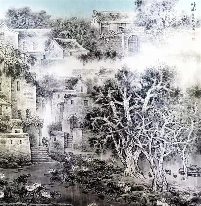 太行山里的石头房,胶东沿海的砖瓦红房,徽派的马头墙等都是我作品中扑捉的对象,以民居村落为主体的创作思路,使我对作品的创造更易接地气,更富有了人文情怀,对于笔墨构成和运用上发挥线的表现功能,让画面充满了律动,富于了更美的节奏。观之,则有如烟如霭,求其妙在画外的趣味。那些纵笔的快意,水墨的酣畅,思维的跳跃,笔触的灵动。览之,让人感动叹服,回味不尽。绘画创作过程中所谓追求笔墨的随意生发,说的就是这个道理,他是画家表达情怀释放的过程。只有敬畏大自然,敬畏劳动者,了解并熟知他们,热爱他们,绘画才能有感而发。作品要感动别人首先要感动自己,心有感慨时,我们的作品就会成为了绘者精神升华的途径。