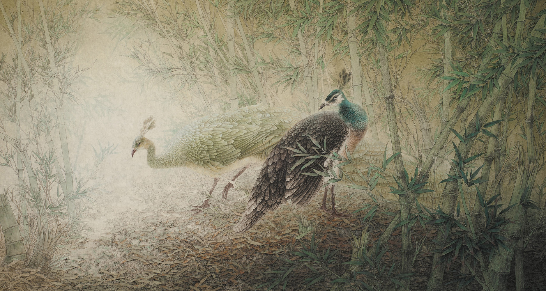 画家黄兴辉的清奇之美,首先是平中见奇。画家善于在寻常的生活中发现独特的美,其花鸟的主体意象大多取自习见习知的题材,目之所触的色调,而通过才情的表达,智慧的熔铸,创制出了清奇雅致的艺术形象。细品那欢鸣的百灵,清啭的孔雀,翩跹的丹顶鹤,霞光中的粉荷,微雨中的芦苇,别饶风姿,别具神韵,带入那如梦如幻、如醉如痴的艺术意境之中。相同题材常画常新,孔雀和紫竹子是黄兴辉作品中的代表性作品,近些年主要以孔雀和竹子题材创作为主,灵鸟们或远眺,或嬉戏,或嘤鸣,佳卉们或含情妍笑,或沐雨嫣然,或弄风摇曳,无不风情万种,仪态万方,凸现出画家的高超技艺和独具匠心。画家黄兴辉的《竹子孔雀》作品系列中,秋竹落叶,黑白孔雀构成了虚与实,聚与散,在浓淡,繁简,疏密之间使原本孤静之中有了灵动之气。在《紫丁香》作品系列中,透过繁密的枝叶,绽放的花朵,俏枝鸟雀传达出构思布局和真实情感。在布局上的巧于安排,笔法讲究变化,也增加了作品的巧致和丰富性表现。用情感表达和形式语言的结合,在写实中求意境,在造型中求意境。