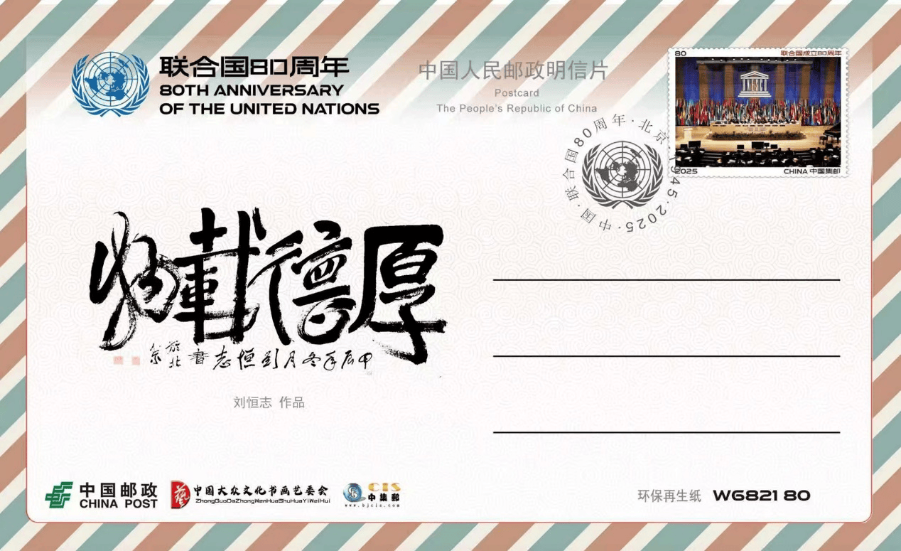这是一张纪念联合国成立80周年的中国邮政明信片。