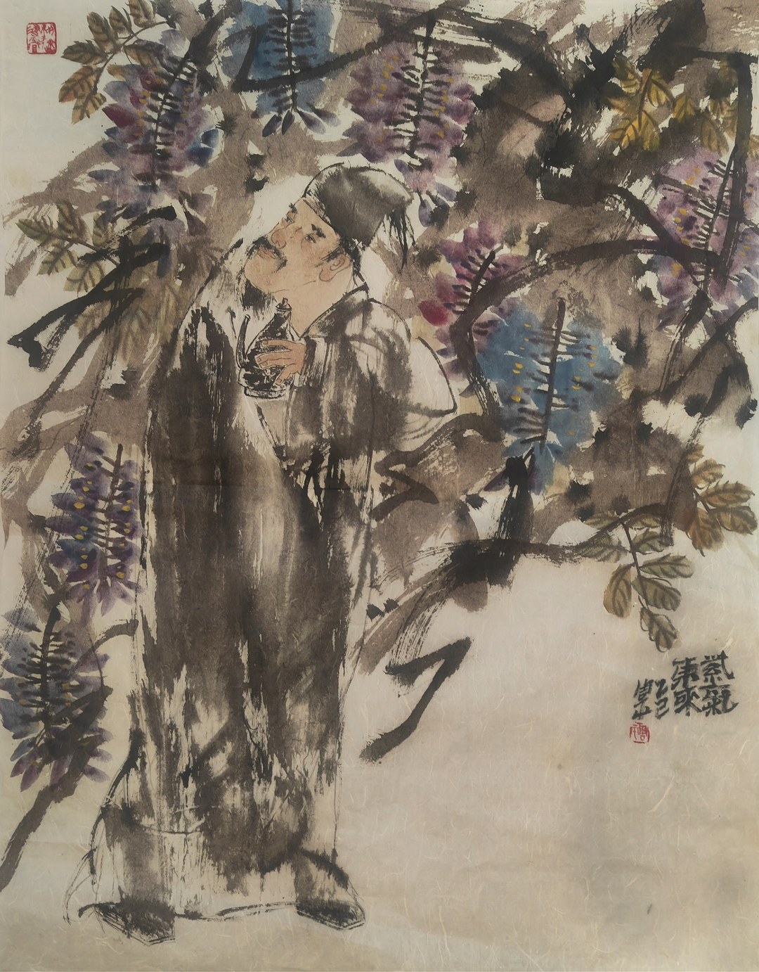 周平先生的荷花作品,其笔致精妙且抒怀写意的线迹勾勒,浓淡相宜又其彩焕然的墨象语汇,随宜而运、夸张赋形之下意态传神、散朗不羁的高士,幞头束发、素衣宽绰、垂袖相交、颌须微翘、昂首伸眉而眺。这望向那隐匿于碧色葱茏、密密深秀莲叶间,白荷蓦然绽放令人心动不已的画面具象呈现,不正是画家以笔下人物之眼为己之眼,将己之神意赋予高士澄澈心怀,而查察自然世界里“出淤泥而不染,濯清涟而不妖”的素净高洁清荷,继而主客契合无间还生命通于天地的内照体现吗?不正是中国绘画艺术创造,表现人格与生命真义的真谛吗?