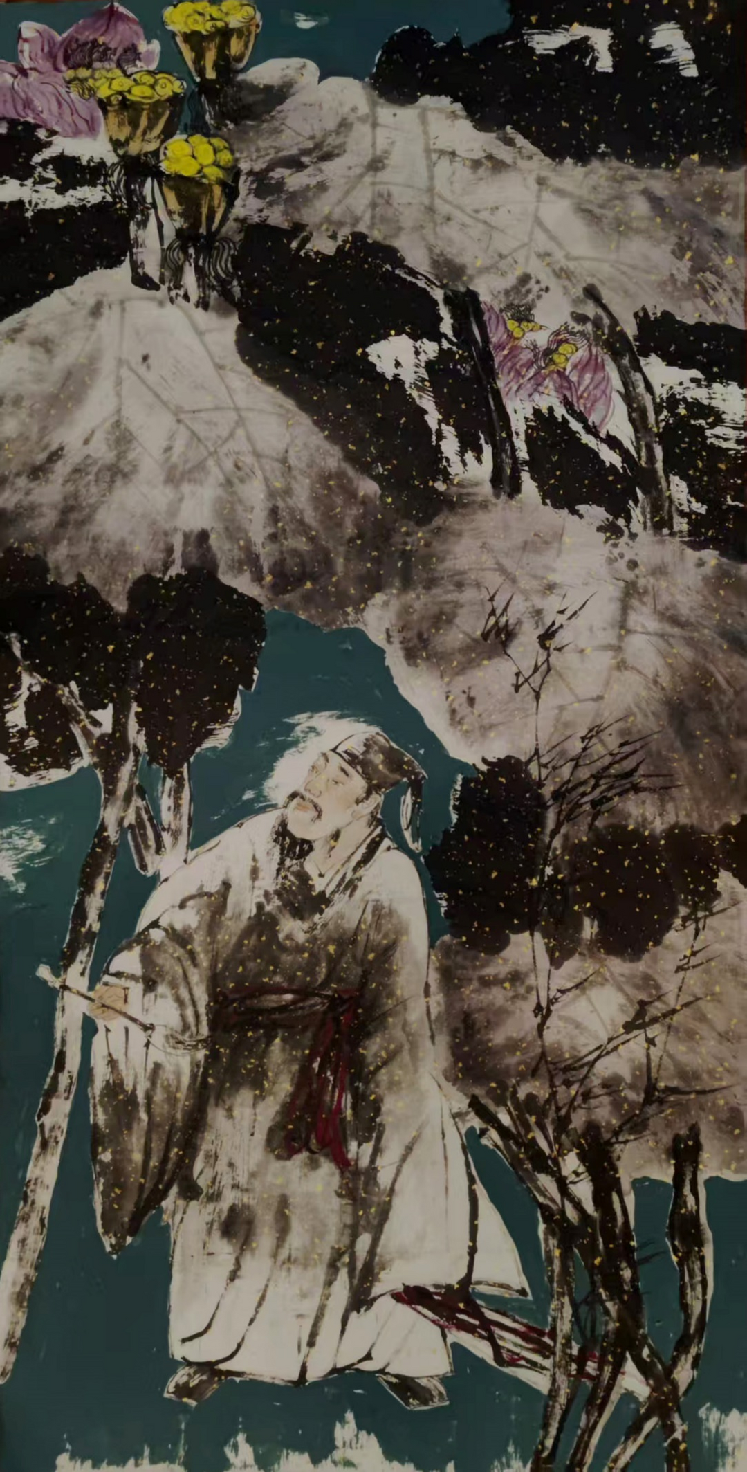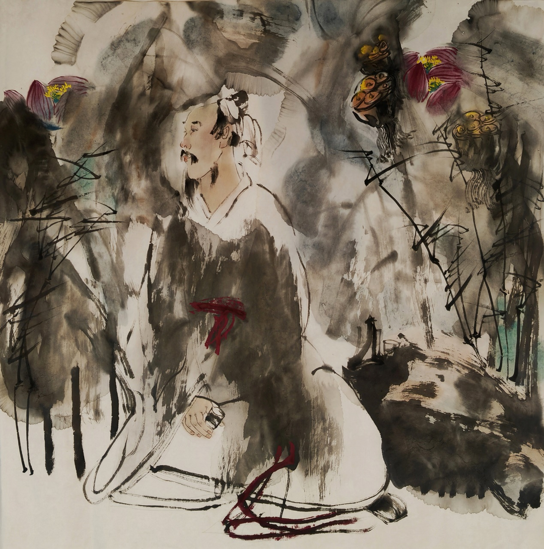 南宋陈郁说:“写其形必传其神,传其神必写其心”。笔者认为中国的绘画艺术,其画面所表露的客体形之外相,内蕴的其神之内涵及抒发的心像世界,或是其所摄对象本体的生命写照。但也不乏画家的主观情感寄寓其上、“我”之精神映射其中,甚至于文人画中大多时候都是倾向于审美主体的情感抒发的,周平先生的荷花高士画作即如此。如《清洁无尘染》一幅,笔者于其表现田田擎举荷叶的泼染团团墨象间,于其呈现残荷枯叶而同水墨交融互渗的绚烂橙黄色彩中,所见的更多是超然物外、物我两忘,而与“道”之絪蕴同机的生命律动。画面中,那头戴笠帽、衣袂洒落,闲逸坐于这“无染”荷丛中的高士,亦正是画家的心像虚影映照于画面的具体化、肉身化呈现,是其心境中超然之美的“荷”之写照,是其泼墨“荷之世界”而志道游艺的精神追求。